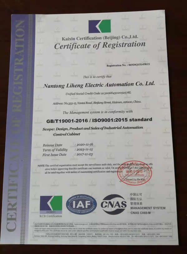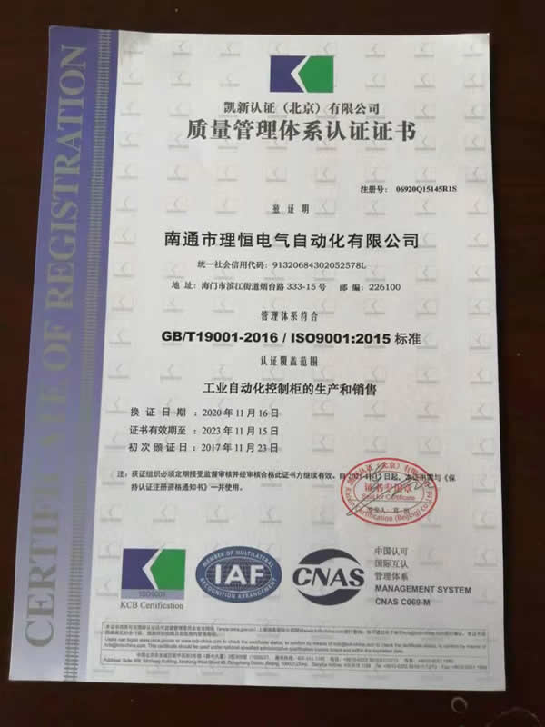 近日,我司工業(yè)自動(dòng)化控制柜生產(chǎn)和銷售的全面質(zhì)量管理體系通過有關(guān)專家組織的現(xiàn)場考評(píng)驗(yàn)收,公司管理體系符合GB/T19001-2016/ISO9001:2015標(biāo)準(zhǔn),換取新證。