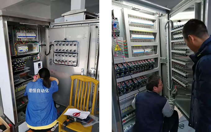 圖為公司技術人員在為準備發(fā)往廣州大陵河某凈水廠的PLC自動化控制柜作發(fā)貨前的驗收